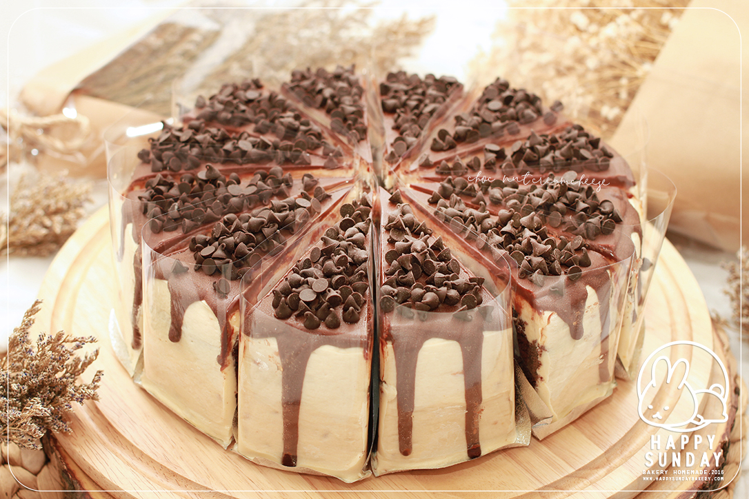 “Sponge Chocolate Cake เนื้อนุ่ม สอดไส้และปาดด้วย PeanutButter CreamCheese ที่ตีจนฟูนิ่มให้ทั่วทั้งเค้ก ตอกย้ำความอร่อยด้วย Chocolate Ganache ราดเคลือบด้านบน Topping ด้านบนด้วย Chocolate Chips ใครชอบทานเนยถั่วห้ามพลาดเม
